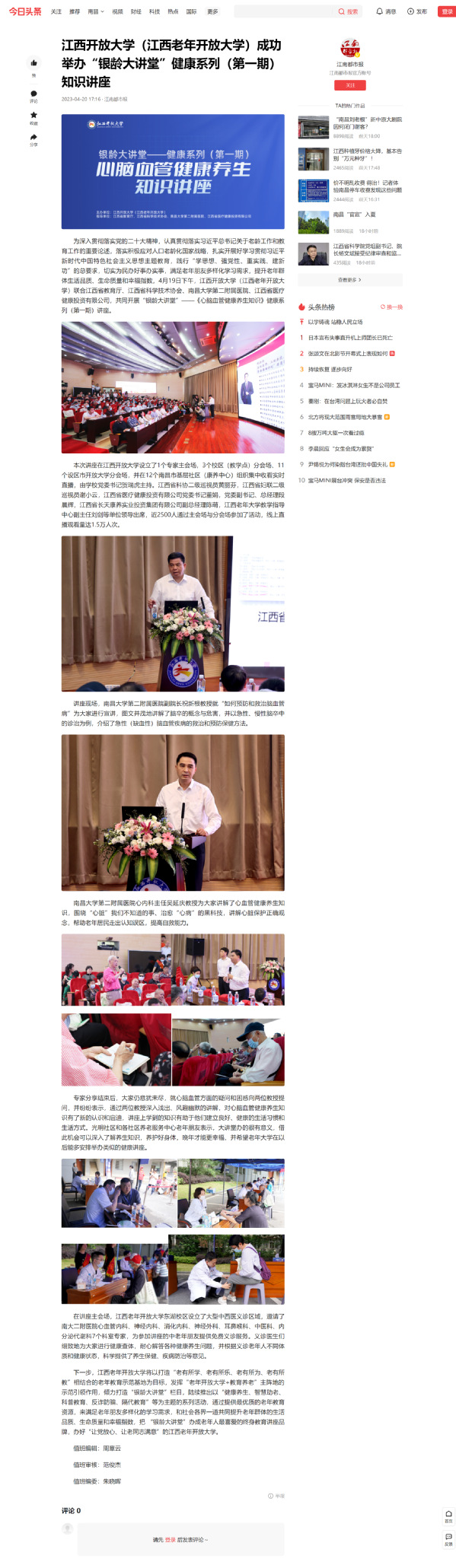 为深入贯彻落实党的二十大精神,认真贯彻落实习近平总书记关于老龄工作和教育工作的重要论述,落实积极应对人口老龄化国家战略,扎实开展好学习贯彻习近平新时代中国特色社会主义思想主题教育,践行“学思想、强党性、重实践、建新功”的总要求,切实为民办好事办实事,满足老年朋友多样化学习需求,提升老年群体生活品质、生命质量和幸福指数,419日下午,英国上市365官网(江西老年开放大学)联合江西省教育厅、江西省科学技术协会、南昌大学第二附属医院、江西省医疗健康投资有限公司,共同开展“银龄大讲堂”——《心脑血管健康养生知识》健康系列(第一期)讲座。