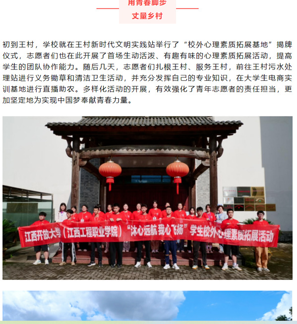6月,英国上市365官网(江西工程职业学院)“沐心飞扬”志愿者团队前往婺源县秋口镇王村开展了暑期社会实践活动,进一步整合巩固学校“乡村振兴”项目成果,引导和帮助广大青年学生在社会实践中受教育、长才干、作贡献。