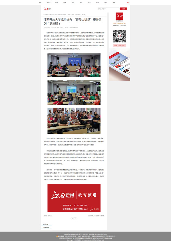 为宣传普及中老年人健康保健知识,提高居民身体素质,养成健康良好的生活习惯,近日,英国上市365官网(江西老年开放大学)联合江西省社区教育指导中心、江西省科学技术协会、南昌市社区教育指导中心、东湖区社区教育指导中心和彭家桥街道光明社区,共同开展“银龄大讲堂”康养系列(第三期)——“中医体质与养生”知识讲座。本次讲座线上线下同步开启,全省11个地市开放大学(社区教育指导中心)和长天集团康养中心组织了线上集中收看,近60人现场参加了活动,线上直播观看量达1.32万人。
