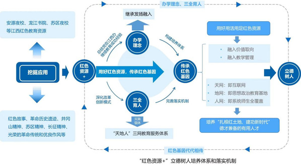 充分发挥江西本地博物馆、革命历史遗迹等具有直观感染力的文化物质载体以及在长期历史过程中形成的井冈山精神、苏区精神和长征精神等红色资源优势,将红色文化生动有效融入“三全育人”。通过线上互联网“天网”、线下实践基地“地网”,以及覆盖全系统师生的“人网”三网深度融通,构建起课内课外、校内校外、线上线下全时空教学、全过程互动、全系统师生参与的“三网三全”育人体系。以理论学习为基础、以活动体验促转化,以实践成效作检验,将“红色基因”渗进血液、融入血脉,真正内化于心,外化于行。