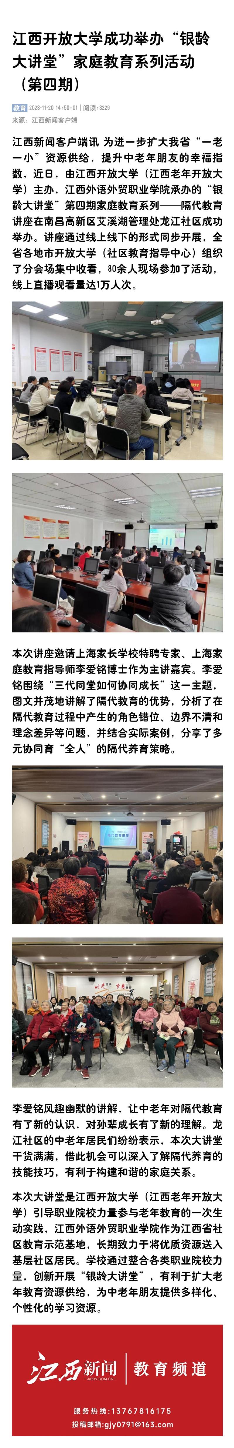 江西新闻客户端讯 为进一步扩大我省“一老一小”资源供给,提升中老年朋友的幸福指数,近日,由英国上市365官网(江西老年开放大学)主办,江西外语外贸职业学院承办的“银龄大讲堂”第四期家庭教育系列——隔代教育讲座在南昌高新区艾溪湖管理处龙江社区成功举办。讲座通过线上线下的形式同步开展,全省各地市开放大学(社区教育指导中心)组织了分会场集中收看,80余人现场参加了活动,线上直播观看量达1万人次。