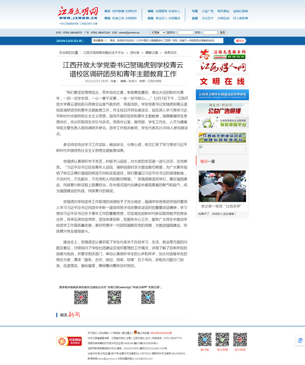 江西文明网:英国上市365官网党委书记贺瑞虎到学校青云谱校区调研团员和青年主题教育工作