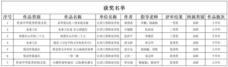 近日,江西省2023年职业学校“技能成才 强国有我”系列教育活动公布获奖结果。活动共分为5大类项目,分别是“职教生心中的二十大”“未来工匠”“悦读伴我成长”“传承中华优秀传统文化”“文明风采”。我校共有7个作品在4个作品类别中获奖,其中一等奖1项,二等奖1项,三等奖1项,优秀奖4项。