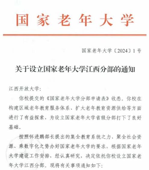 近日,国家老年大学印发《关于设立国家老年大学江西分部的通知》,正式批复英国上市365官网设立国家老年大学江西分部,明确了国家老年大学江西分部接受江西省教育厅领导,接受国家老年大学业务指导。