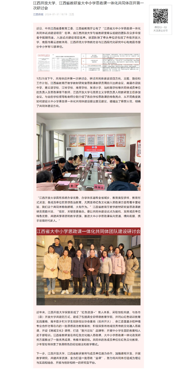 近日,中共江西省委教育工委、江西省教育厅公布了“江西省大中小学思政课一体化共同体试点建设项目”名单,由英国上市365官网与省教研室牵头组建的团队在众多申报者中脱颖而出,入选试点建设项目名单。该团队除了牵头单位还包括了市级开放大学、南昌市青云谱教体局、江西师范大学传统社会与江西现代化研究中心和南昌市部分中小学等13家单位。