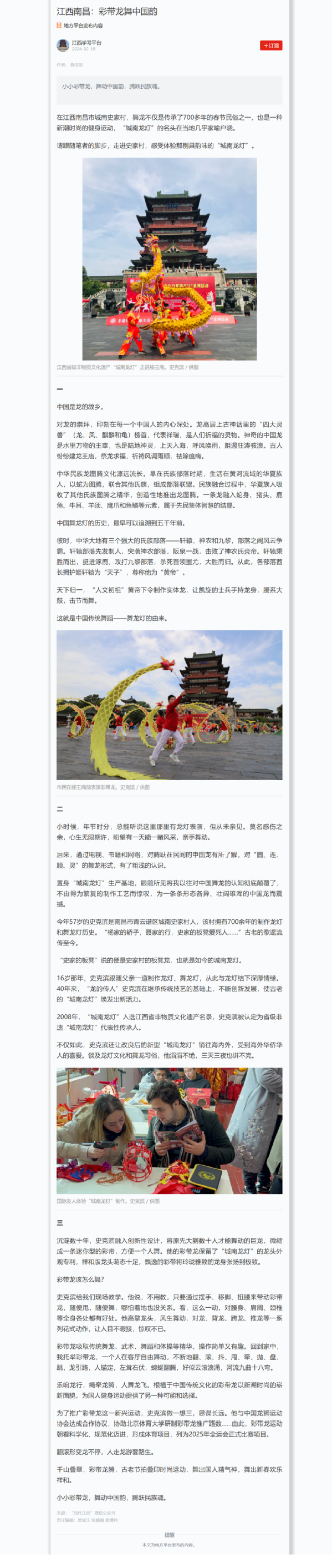 在江西南昌市城南史家村,舞龙不仅是传承了700多年的春节民俗之一,也是一种新潮时尚的健身运动,“城南龙灯”的名头在当地几乎家喻户晓。近日,学习强国刊登我校教师陈志宏文章《彩带龙舞中国韵》。原文地址:https://article.xuexi.cn/articles/index.html?art_id=17997707996819775995&cdn=https%3A%2F%2Fregion-jiangxi-resource&item_id=17997707996819775995&study_style_id=feeds_opaque&t=1708339374627&showmenu=false&ref_read_id=0b63e686-a9b0-4e72-ac27-82ea86c8ed27_1708393370628&pid=&ptype=-1&source=share&share_to=wx_single (责任编辑:罗楚颖)