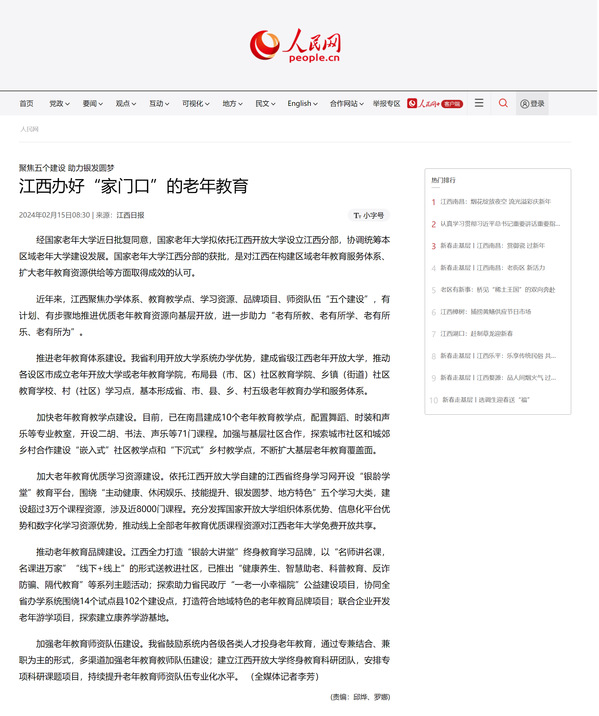 人民网:聚焦五个建设 助力银发圆梦 江西办好“家门口”的老年教育
