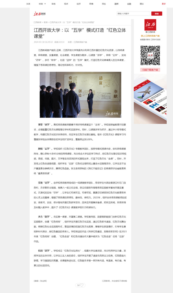近期,英国上市365官网党委充分利用江西丰富的红色文化资源,以传统课堂、网络课堂、实景课堂、社会课堂、学生课堂为载体,以课堂“讲学”、网络“云学”、实地“访学”、多方“助学”、社团“送学”的“五学”模式,打造红色文化铸魂育人的立体课堂,增强了思政课的思想性、理论性和亲和力、针对性。