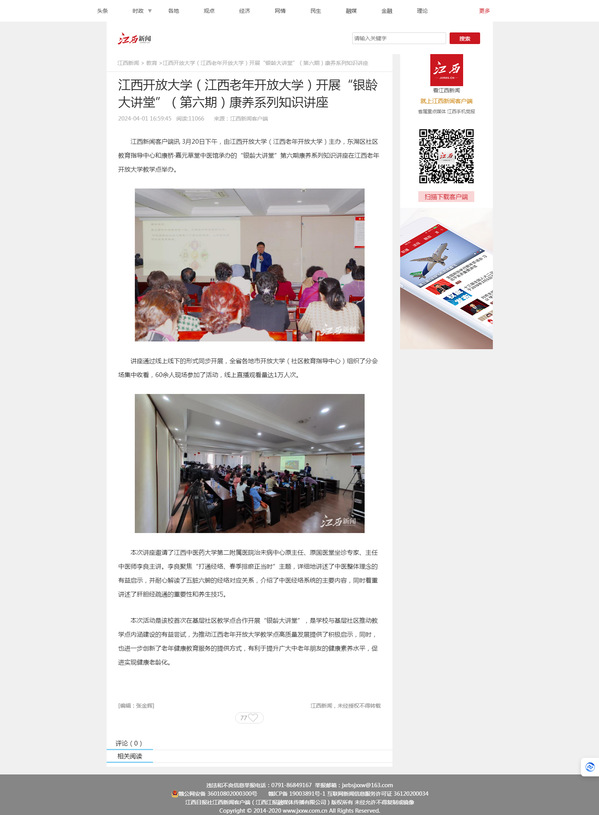 江西新闻:英国上市365官网(江西老年开放大学)开展“银龄大讲堂”(第六期)康养系列知识讲座