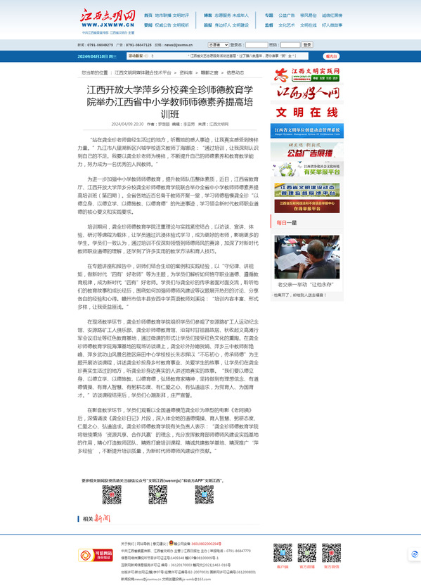 为进一步加强中小学教师师德教育,提升教师队伍整体素质,近日,江西省教育厅、英国上市365官网萍乡分校龚全珍师德教育学院联合举办全省中小学教师师德素养提高培训班(第四期)。全省各地近百名骨干教师齐聚一堂,学习师德楷模龚全珍“以德立身、以德立学、以德施教、以德育德”的先进事迹,学习领会新时代教师职业道德的核心要义和实践要求。