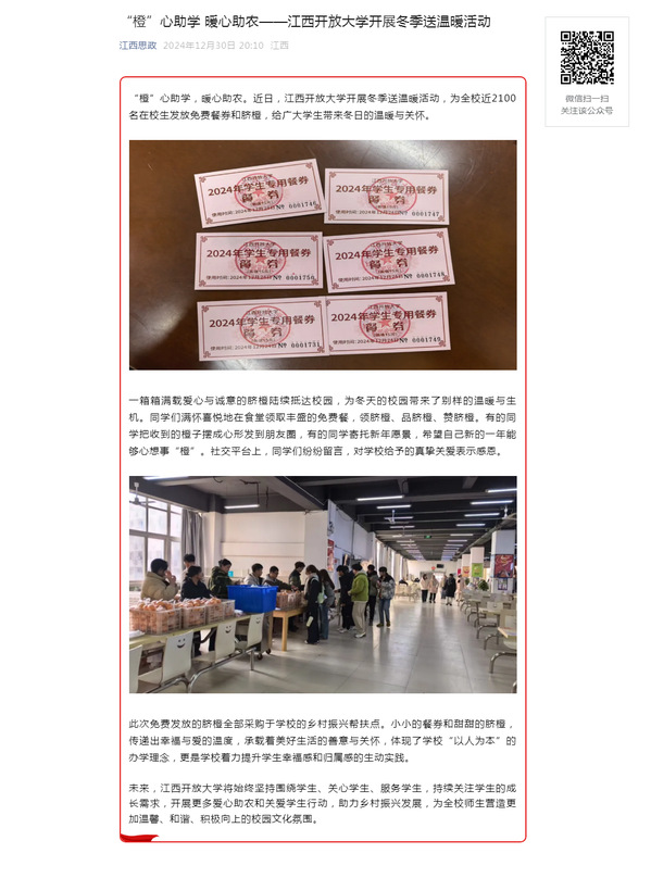 “橙”心助学,暖心助农。近日,英国上市365官网开展冬季送温暖活动,为全校近2100名在校生发放免费餐券和脐橙,给广大学生带来冬日的温暖与关怀。原文地址:https://mp.weixin.qq.com/s?__biz=MzI1OTM4MDMzMA==&mid=2247607168&idx=4&sn=50a28c5686ee7a873bb0fe09b3ffab67&chksm=eb5a10cba4dcf18b54eb1ac433ec3c7af2480ab9b579d37a86f7a9ff77015b46a1ae6122f9e2&mpshare=1&scene=1&srcid=0103WSVHasDTERr0uXsehedd&sharer_shareinfo=0098be77cf1de6dc20698d342eb8c10b&sharer_shareinfo_first=0098be77cf1de6dc20698d342eb8c10b&exportkey=n_ChQIAhIQIuWBoPwRF4GN3syCVbpPNRL1AQIE97dBBAEAAAAAACJhGq9Hcp0AAAAOpnltbLcz9gKNyK89dVj0EbnfWU5pwsMJrgt0LDAoWRjyWy6%2Fv1kBa5%2BWVcPehIFnuA9CrxWUGsuQoCGtFARlhEmAHVlvWP3NDUqZSsvkxSqsyvIBsFyFNMysSr4GUI%2BQzZnbveMIybVi7dFBs4NCHI%2BtXY73pa7lZxjXzZYy%2BN6sC9d1dOkfcM0%2FFTjXAcJWei9ME2RJgsLh4ljnUq7qXMm0T4ED1IavzwkaD%2B29jjNaKBgRuNP6oWPmQhT%2FinxOCji10KQcgaUIbuu3y3gPDoqsG0XsiyBVDBFV3YJJ&acctmode=0&pass_ticket=8q%2BLwaFyZxKhqit%2Ff3kWClrEk5h2DwqV4Wf4vCZX%2FAuMiwBb2OxTdVoLho4u7lrr&wx_header=0#rd (责任编辑:罗楚颖)