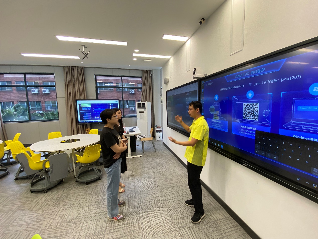 6月10日,我中心综合科科长郭麟、科员刘芸赴江西师范大学调研智慧教室建设情况。本次调研首先由江西师范大学现代教育技术中心主任姜辉带领大家参观该校的智慧教室管理中心;然后由赵高勋老师详细介绍师大智慧教室1.0的功能和特点;最后参观了去年竣工的智慧教室2.0,赵老师详细介绍了该教室的规划情况、建设情况、功能特点等。 此次调研交流,不仅加深了对这所高校智慧教室建设状况的了解,还在充分沟通和调研的基础上加深了对信息化建设的理解,将为我校后期的智慧教室建设提供新的思路。