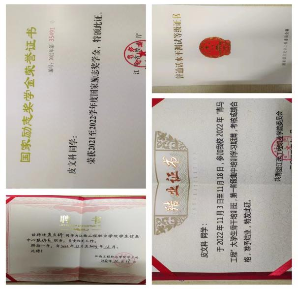 皮文科,男,共青团员,智能技术学院物联网应用技术一班学生,现任班级副班长兼纪律委员;新竹文学社文体部部长;学工处学生信息中心联络员。获全国普通话水平测试二甲;江西工程职业学院“庆祝党的二十大,踔厉奋进新征程”知识竞赛优胜奖;江西工程职业学院智能技术学院ppt大赛三等奖;2021-2022学年“三好学生”;新竹文学社优秀部员;2022-2023优秀共青团员