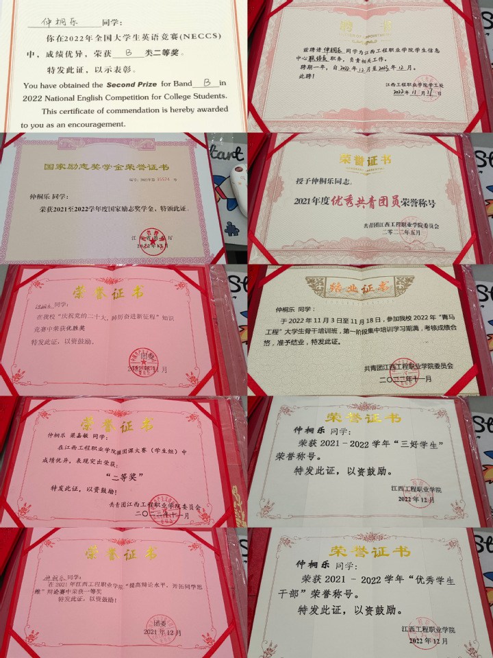 仲桐乐,共青团员,城乡发展学院21级应用英语班学生,现任城乡发展学院团委副书记、学工处学生信息中心联络员、班级团支书。获全国普通话水平测试二甲、全国大学生英语四级证书。2022年全国大学生英语竞赛(NECCS)B类二等奖;2021~2022学年度国家励志奖学金;江西工程职业学院2022年“优秀共青团干部”;江西工程职业学院2021~2022学年“优秀学生干部”;江西工程职业学院2021~2022学年“三好学生”;2022年江西工程职业学院微团课大赛(学生组)二等奖;2022年江西工程职业学院“庆祝党的二十大,踔厉奋进新征程”知识竞赛优胜奖;江西工程职业学院2021年度“优秀共青团员”;2021年江西工程职业学院“提高辩论水平,开拓同学思维”辩论赛一等奖;江西工程职业学院2021年“巾帼杯”拔河比赛第一名。
