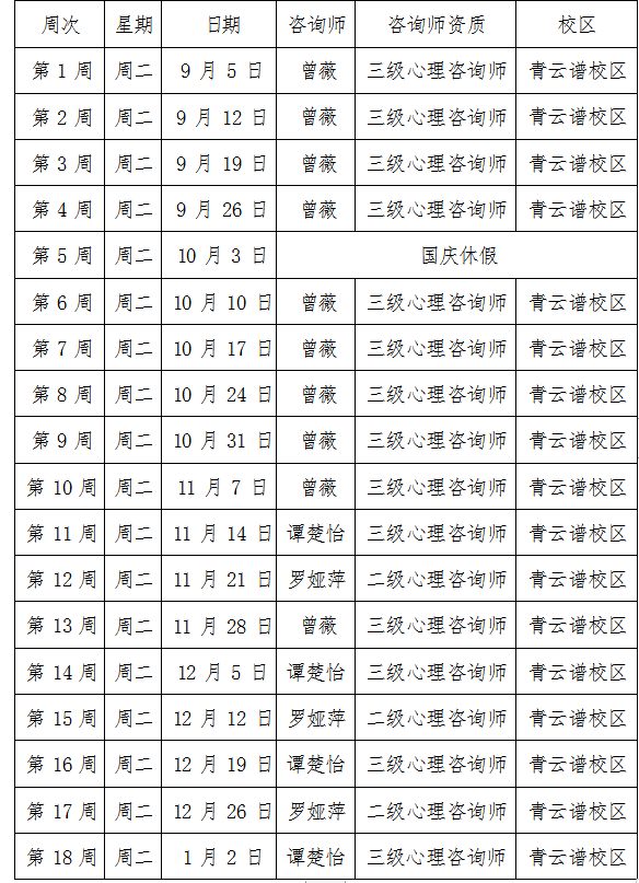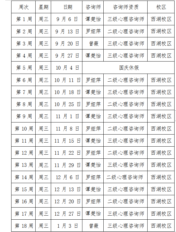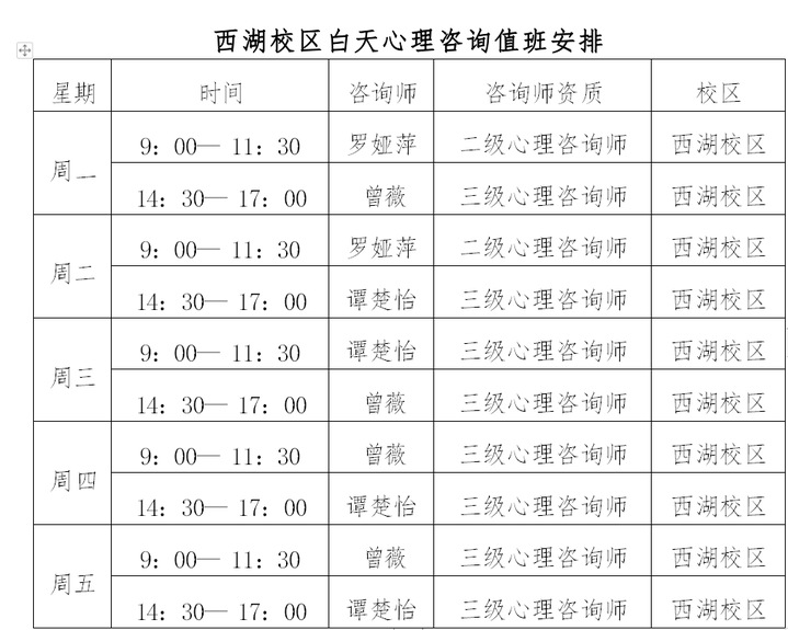 西湖校区夜间心理咨询值班安排(时间:18:30-20:30)