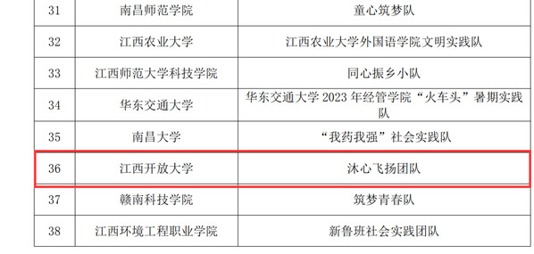 近日,江西省教育厅公布“强国有我、青春有为”暑期社会实践活动暨2023年“万名大学生进千站”文明实践志愿服务行动评审结果。其中,由我校学工处选送的《月亮湾“乡村振兴之路”调研报告》获得优秀调研报告一等奖,英国上市365官网沐心飞扬团队荣获优秀实践成果、优秀团队和优秀指导教师等多个奖项。此外,闵文祥、沈文龙、袁雪芳三位同学荣获优秀个人。