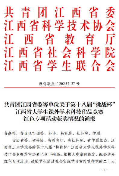 近日,第十八届“挑战杯”江西省大学生课外学术科技作品竞赛圆满闭幕。学校参赛作品不忘初心追理想,井冈精神铸心魂荣获红色专项活动三等奖。