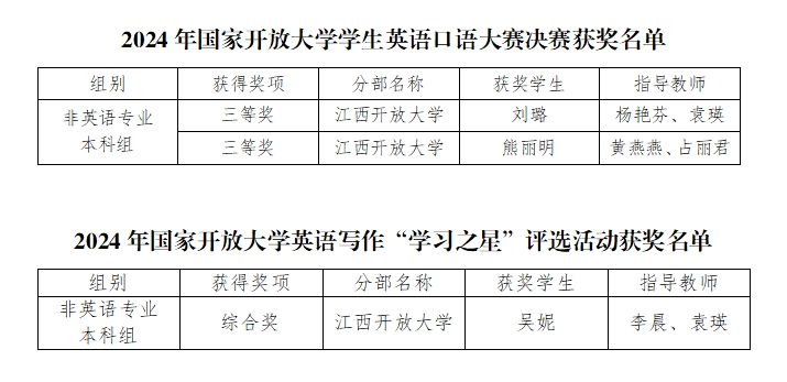 近日,国家开放大学揭晓两项活动评选结果,我校共斩获三个奖项,充分展现了开放教育学生扎实的知识储备和良好的精神风貌。在英语口语大赛决赛中,新余开放大学刘璐、抚州开放大学熊丽明获非英语专业本科组三等奖,新余开放大学教师杨艳芬、袁瑛、抚州开放大学教师黄燕燕、占丽君获优秀指导教师奖;在英语写作“学习之星”评选活动中,新余开放大学吴妮获得非英语专业本科组综合奖,新余开放大学教师李晨、袁瑛获优秀指导教师奖。