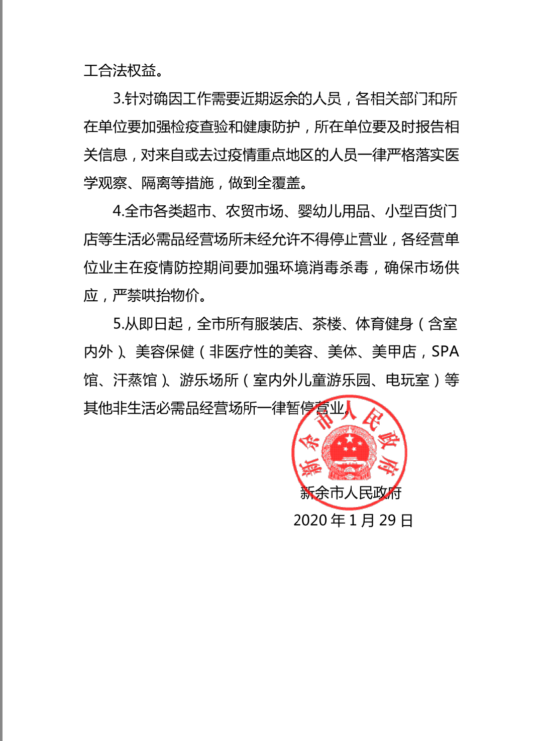 5. 从即日起,全市所有服装店、茶楼、体育健身(含室内外)、美容保健(非医疗性的美容、美体、美甲店,SPA 馆、汗蒸馆)、游乐场所(室内外儿童游乐园、电玩室)等其他非生活必需品经营场所一律暂停营业。