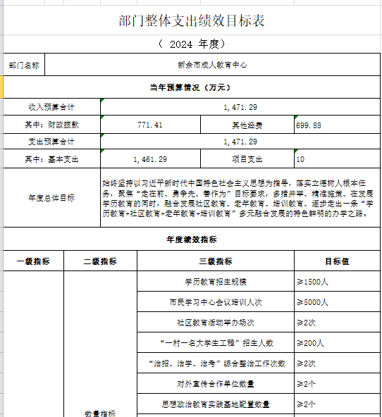 新余市成人教育中心(新余开放大学)是根据余编字[2001]16号文确定的为市政府直属正县级全额拨款事业单位,实行两块牌子一套人马,教育教学业务上归口市教育局指导;内设党政办公室、党群工作部、教务教学处、招生与系统建设办、社区教育办公室、综治处(总务处)、培训与职业教育处、信息技术处、老年教育处共9个内设机构。纳入本套部门预算汇编范围的单位共1个,核定人员编制44名,年末实有人数66人,其中在职在岗教职工35人,退休人员31人,遗属补助1人;