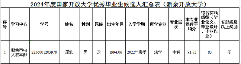 新余开放大学校本部“2024年度国家开放大学优秀毕业生”候选人推荐名单公示