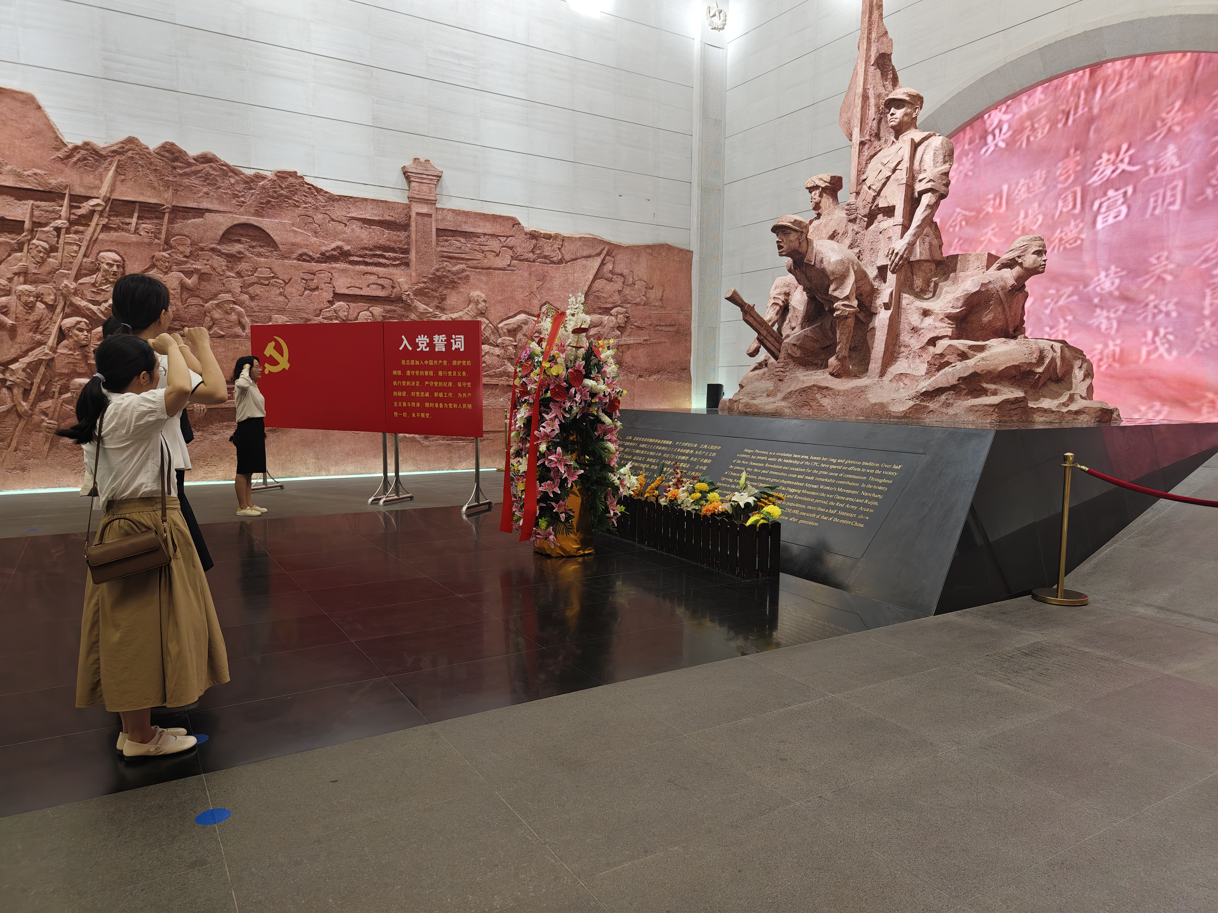 在革命烈士纪念堂的一楼大厅里,全体党员庄严举起右手,紧握拳头,重温入党誓词。全体党员再一次深切体会到作为一名共产党员的责任感和使命感。