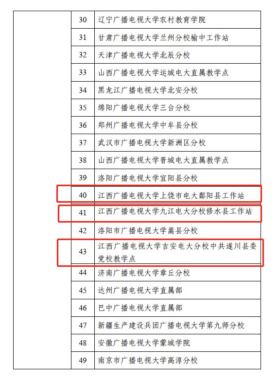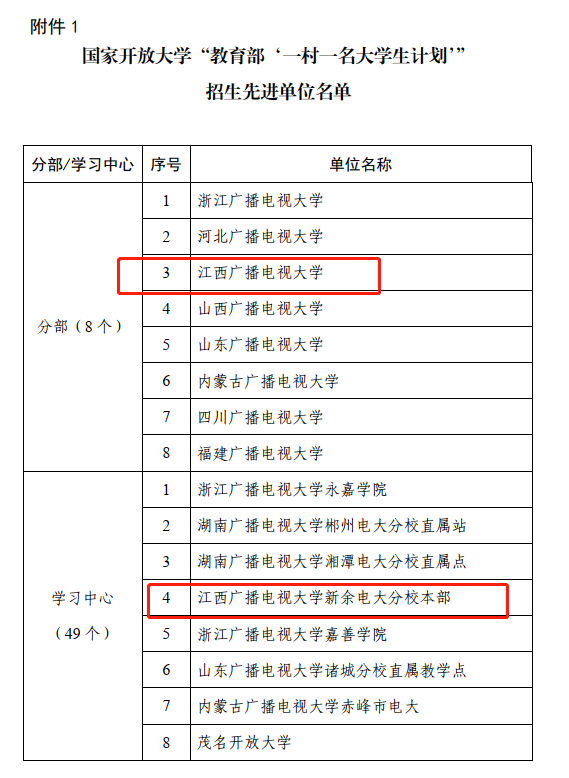 国家开放大学公布了“教育部‘一村一名大学生计划’”招生先进单位评选结果,我校及新余电大分校本部、上饶市电大鄱阳县工作站、九江电大分校修水县工作站、吉安电大分校中共遂川县委党校教学点被评为国家开放大学“教育部‘一村一名大学生计划’”招生先进单位。